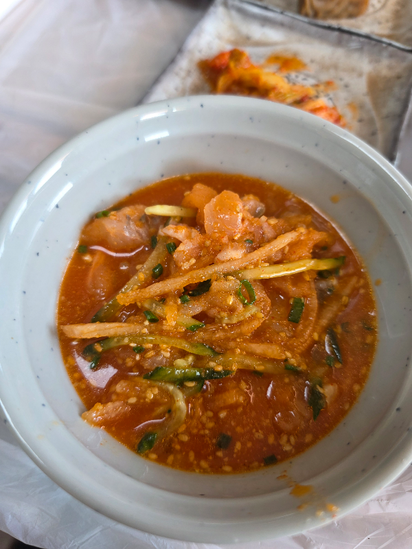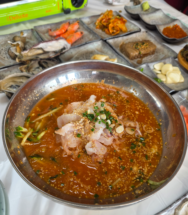 상차림이 2인 3인으로 나눠 나오고 매운탕 올려주시고 물회가 먼저 나옵니다. 오랜만에 먹는 물회가 맛있어 마지막까지 다 먹기는 처음이었어요.