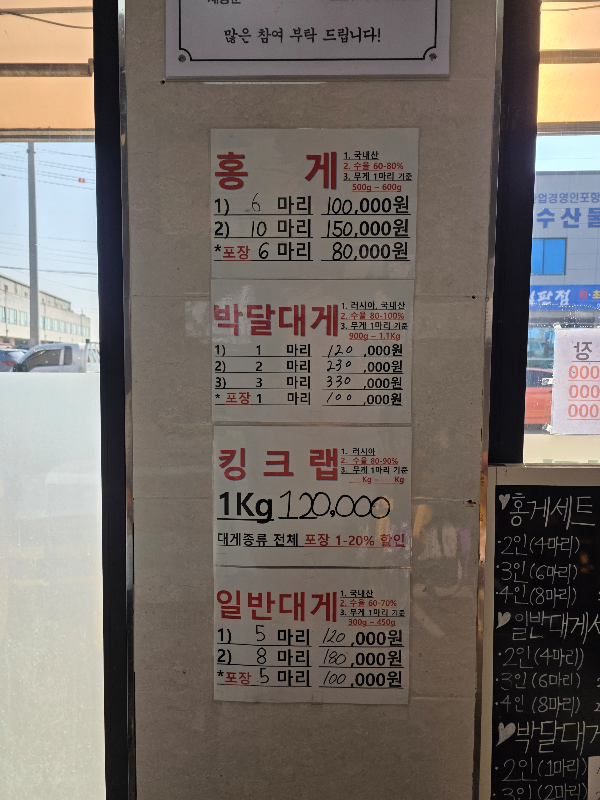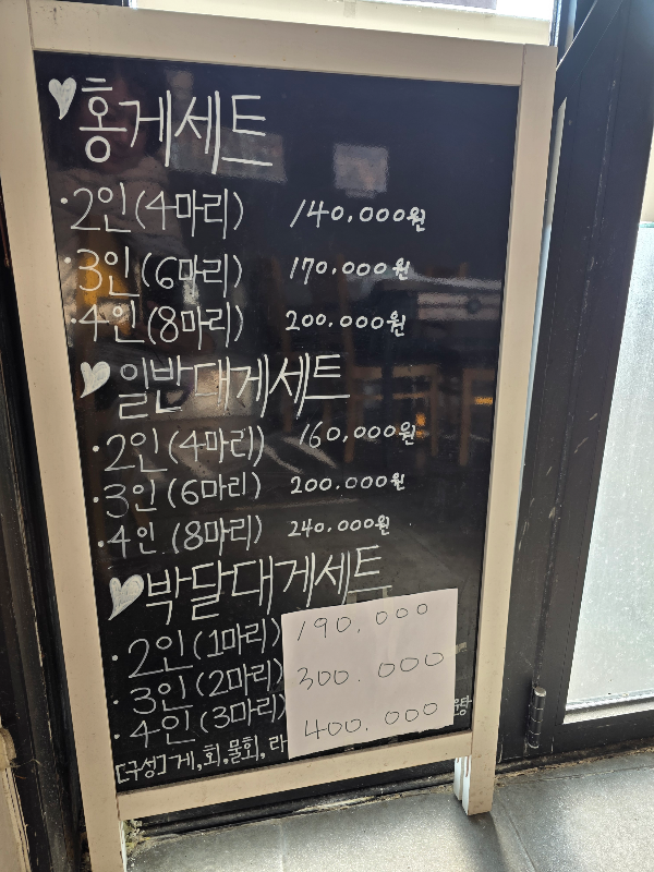 우리는 5명, 일반대게세트를 주문했는데 2인세트+3인세트로 합산되어 계산되더라구요. 가격은 시세 따라 작성해 두셨는데 변경은 있으니 참조만 하시고 전화하시든 직접 가셔서 가격 확인이 정확합니다.