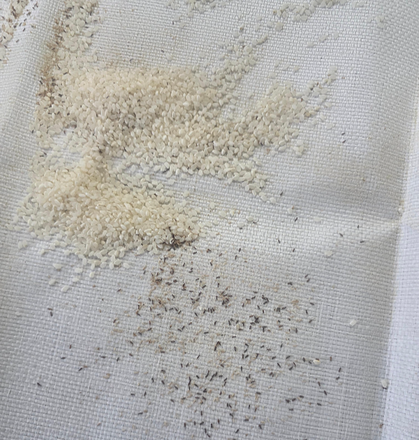 쌀 사이에 하얀 가루나 검은 가루가 섞여 있으면 주의해야 해요. 하얀 가루는 바구미가 쌀을 갉아먹은 찌꺼기고, 검은 가루는 바구미의 배설물이에요. 이런 게 보이면 이미 상당히 번식한 상태예요.