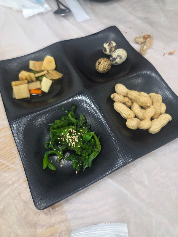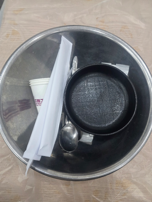 기본 앞접시와 기본찬입니다. 스텐볼에 대게 껍질이 차면 자주 교체해 주십니다.
