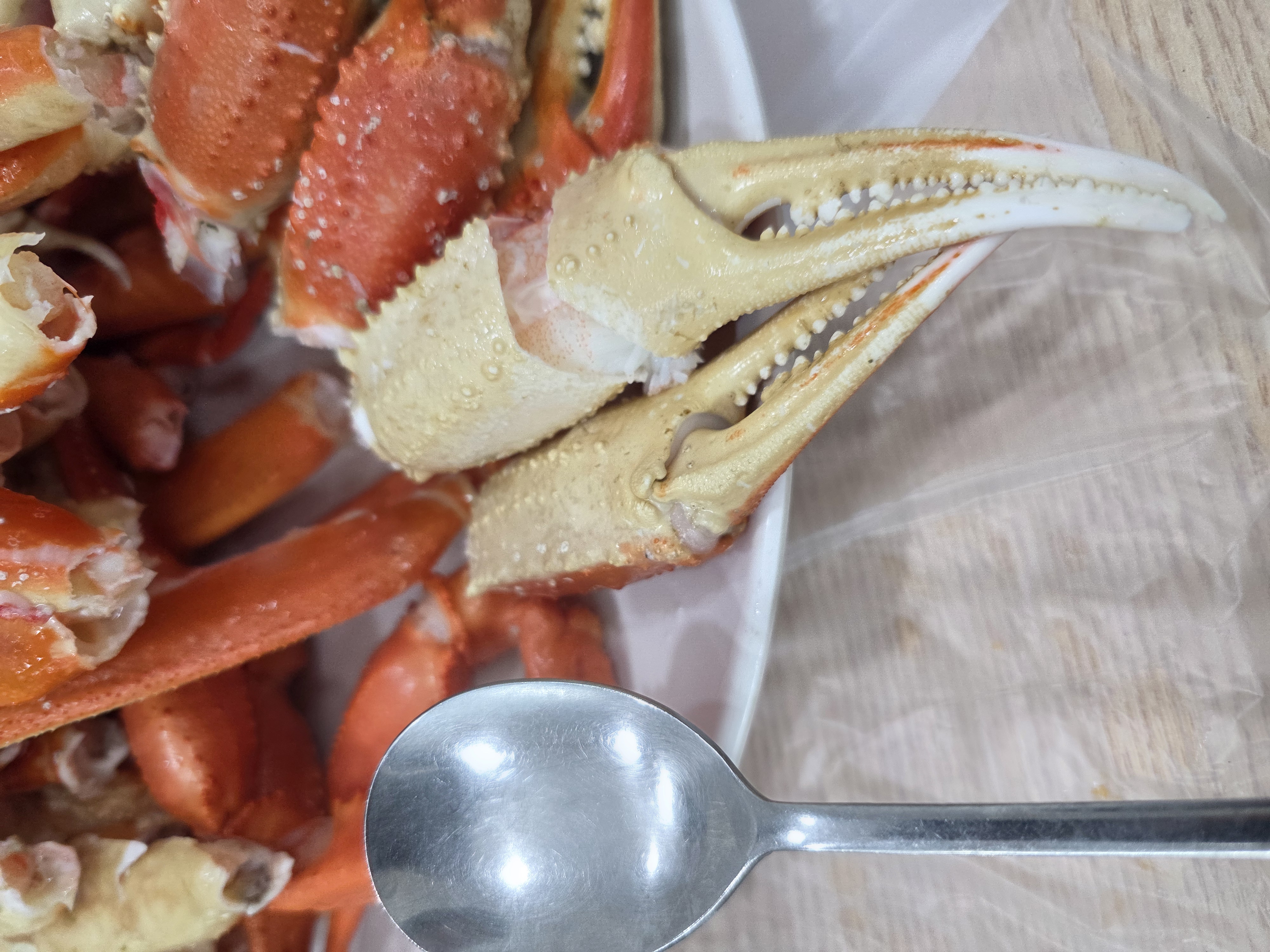 수조에서 대게 건져 올릴 때 사용하시는 도구입니다. 구분 린 숟가락으로 다치지 말라고 배부분을 떠서 건져 올리시더라고요.