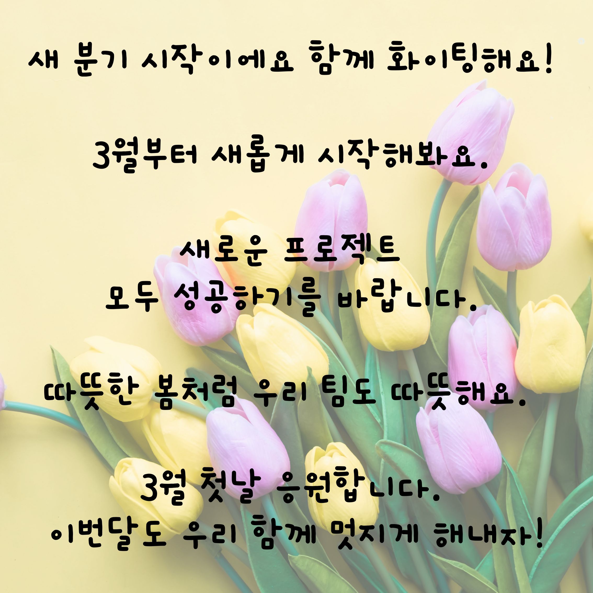 새 분기 시작이에요 함께 화이팅해요 / 3월부터 새롭게 시작해봐요 / 새로운 프로젝트 모두 성공하기를 바랍니다 / 따뜻한 봄처럼 우리 팀도 따뜻해요 / 3월 첫날 응원합니다 / 이 달도 우리 함께 멋지게 해내자